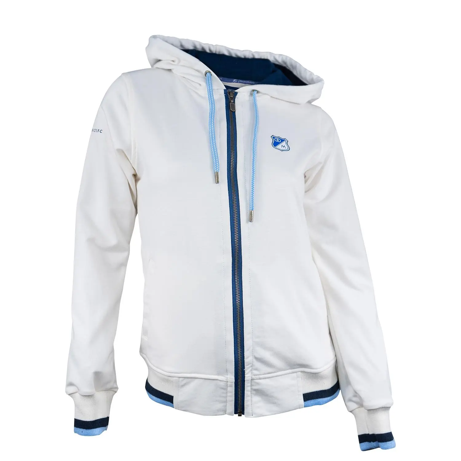 Buzo mujer con capota forrada y cordón plano tejido, cremallera metálica en delantero y bolsillos de ribete con placa contramarcada, unicolor en azul oscuro y marfil. Parche escudo delantero, estampado y logotipo en espalda y manga derecha, pretina y puños en tejido con franjas en contraste.
