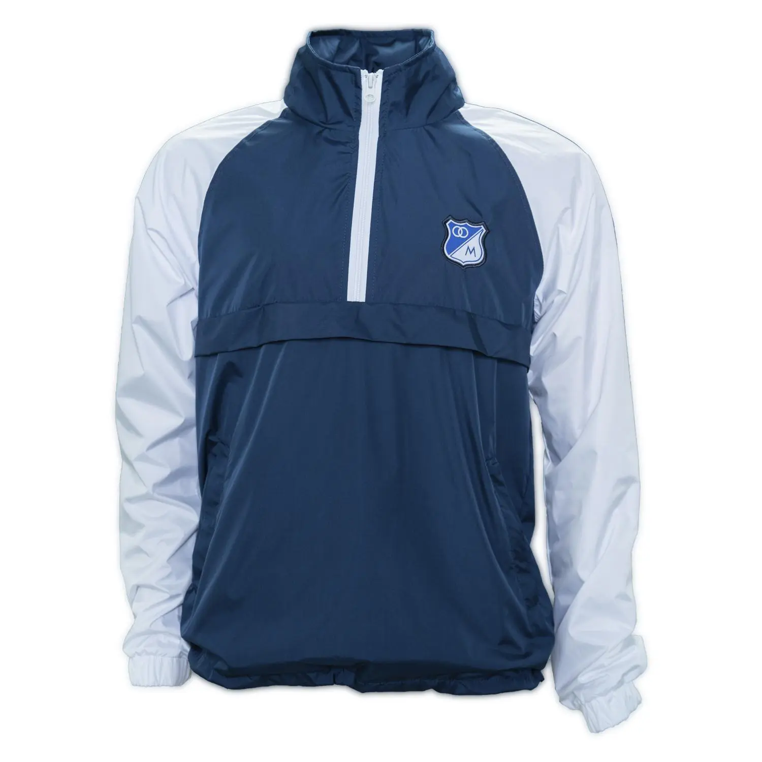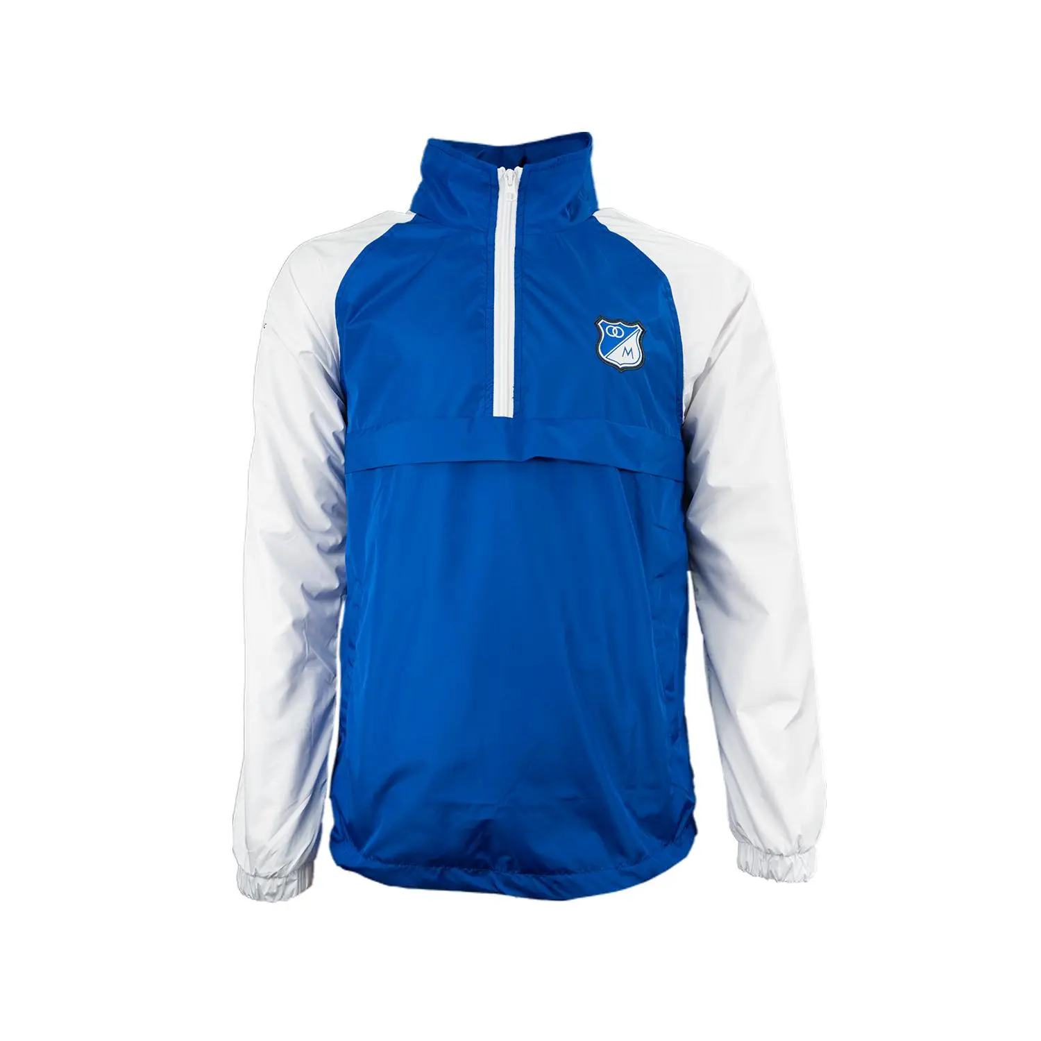 Chaqueta Hombre rompevientos impermeable forrada en malla, escudo full rebordado, cuello alto y media cremallera en delantero y bolsillos de ribete, manga en combinación de color y capota escondida en cuello, puño resortado y ruedo con ajuste de cordón elástico.