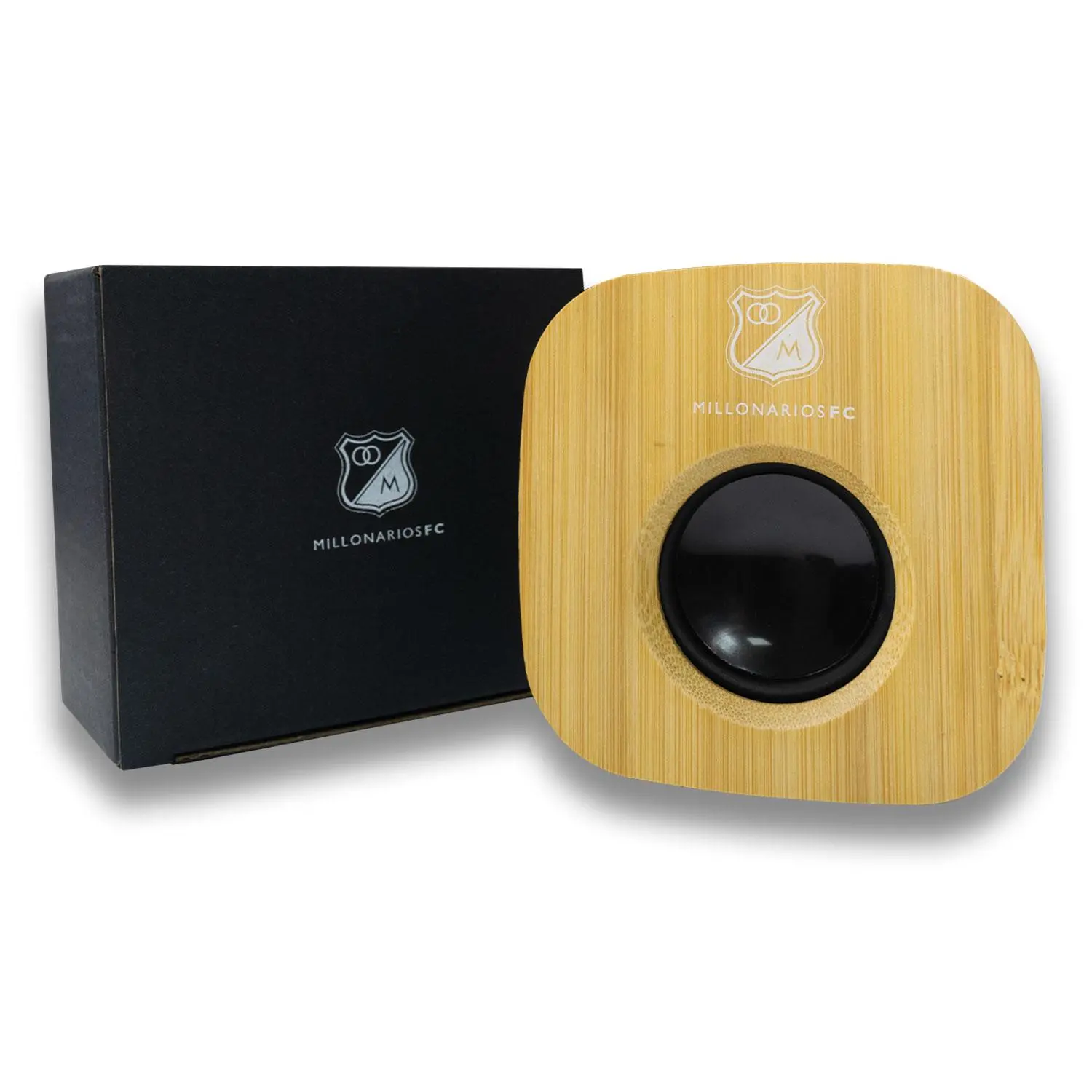 Parlante Bluetooth plástico con parte frontal en bambú. 1X5W, batería incorporada de 1200mAh. Bluetooth 5.0. Lector de tarjeta TF (Hasta 32GB), y USB (no incluidas). Funciona como manos libres. Modo AUX. Empaque caja individual. Medidas:10 cm x 5.5 cm x 9 cm.